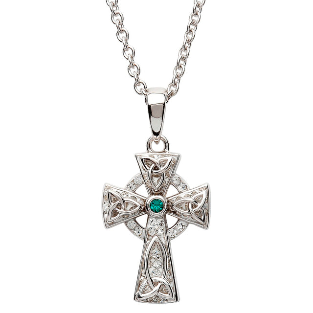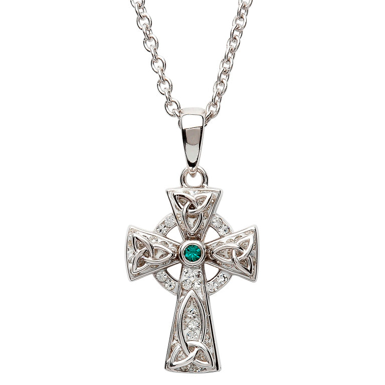 This elegant Celtic cross dazzles with brilliant white Swarovski® Crystals set in a bright Sterling Silver. The pendant shines with white crystals encrusted in the body and the halo, and with a solitary emerald green crystal in the center. The arms of the cross feature finely detailed Trinity Knots crafted in sterling silver.Trinity Knot and Emerald Green