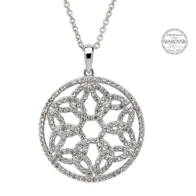 This brilliant Trinity Circle Pendant is as intricate as it is beautiful. Perfectly placed Trinity Knots overlap to create an array of circles, all within a greater outside circle. The entire design piece is dazzling with Swarovski crystals.