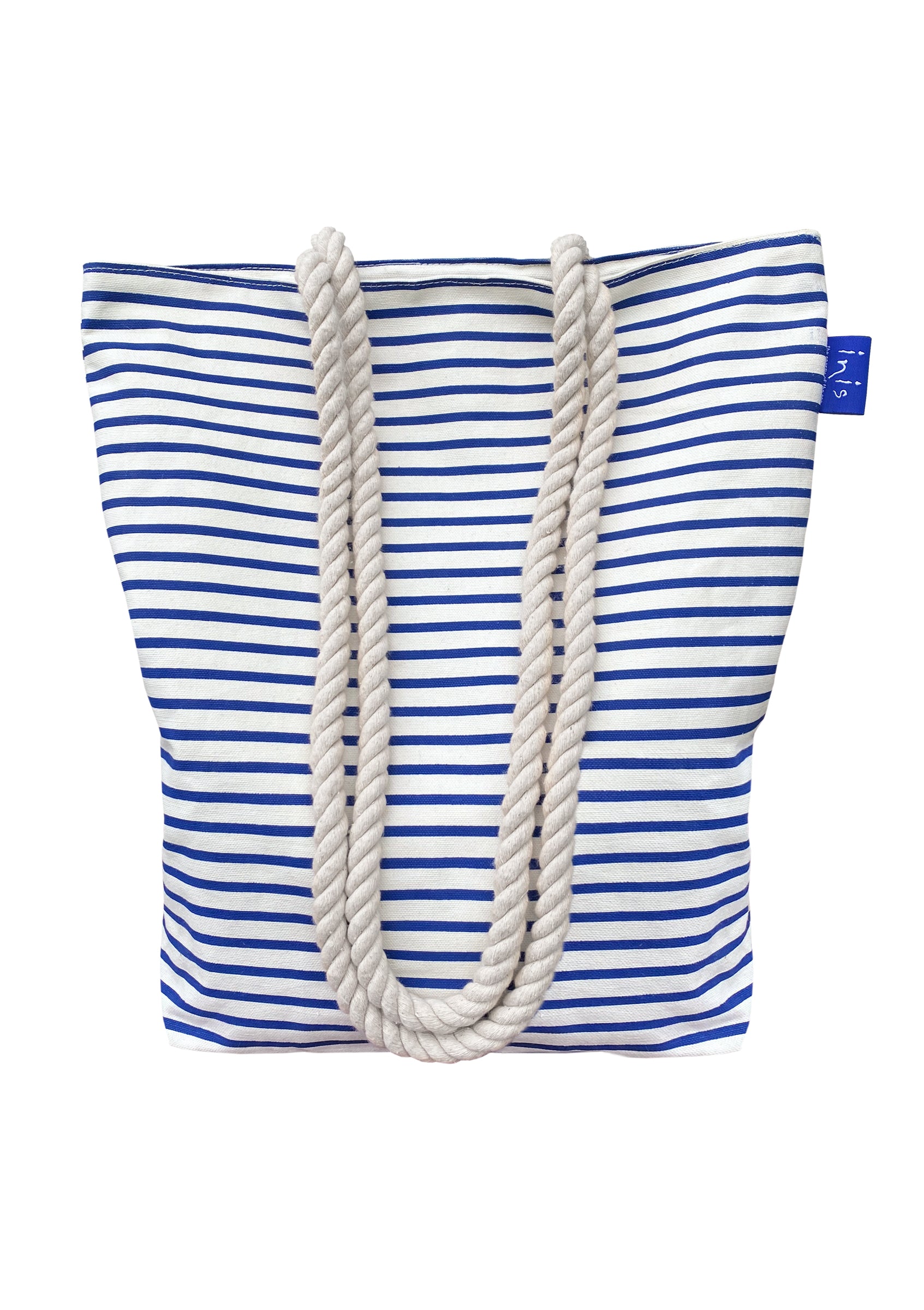 The Inis Blue Striped Beach Bag is the perfect bag to bring to the beach. This large blue and white striped canvas tote bag is fully lined, has cotton rope handles and a zipper top. Inis contributes to the protection and conservation of Whales and Dolphins.