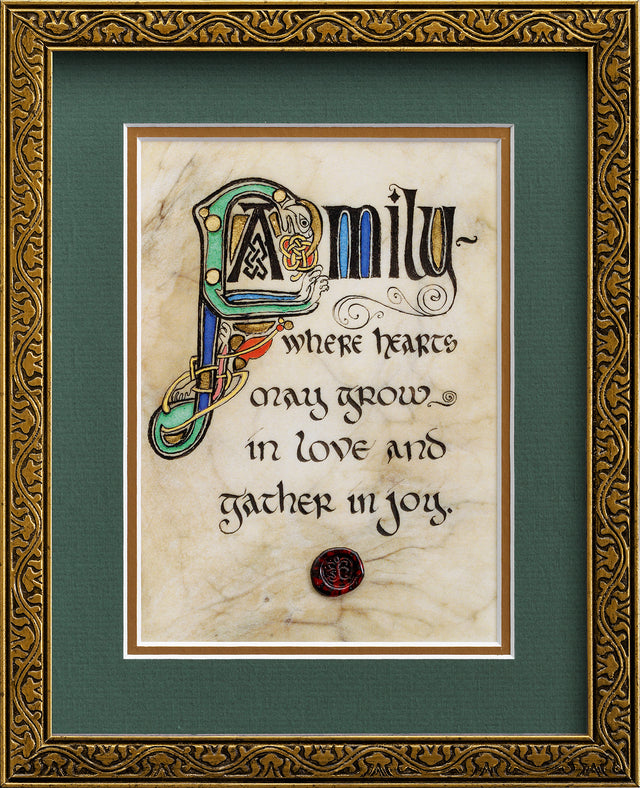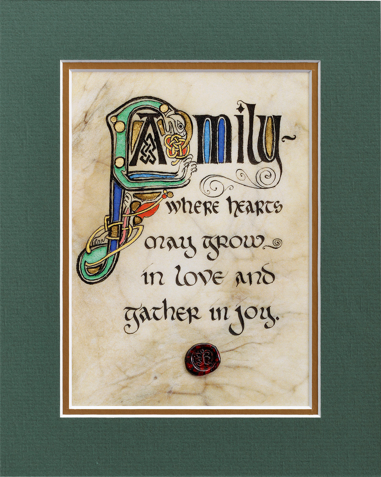 - Fine art print reproduction of original illuminated manuscript hand-lettered onto calfskin vellum by the artist