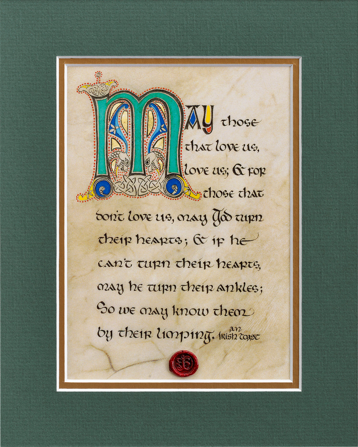 - Fine art print reproduction of original illuminated manuscript hand-lettered onto calfskin vellum by the artist