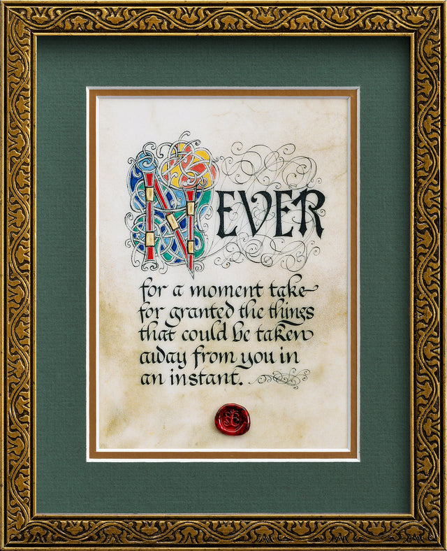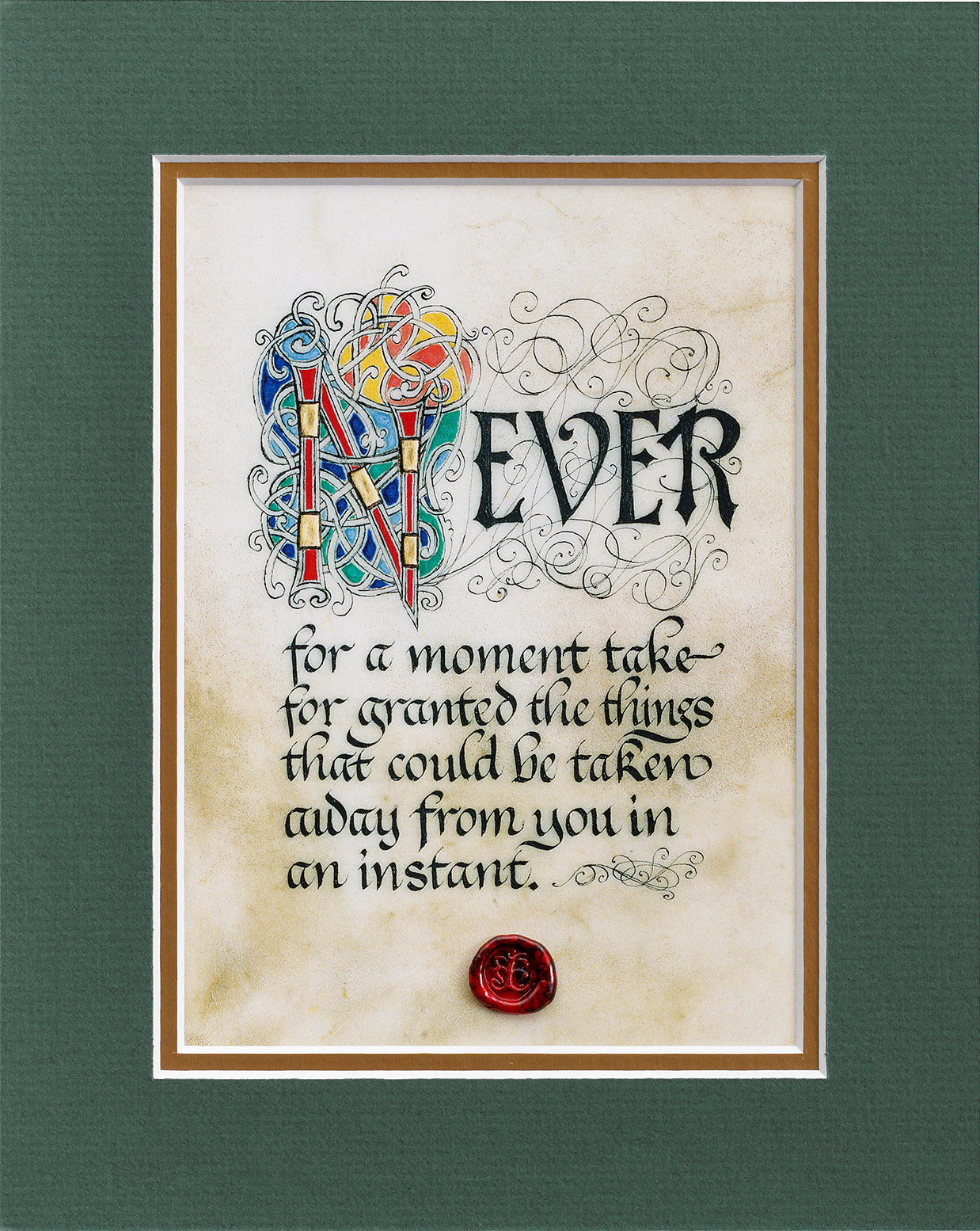 - Fine art print reproduction of original illuminated manuscript hand-lettered onto calfskin vellum by the artist