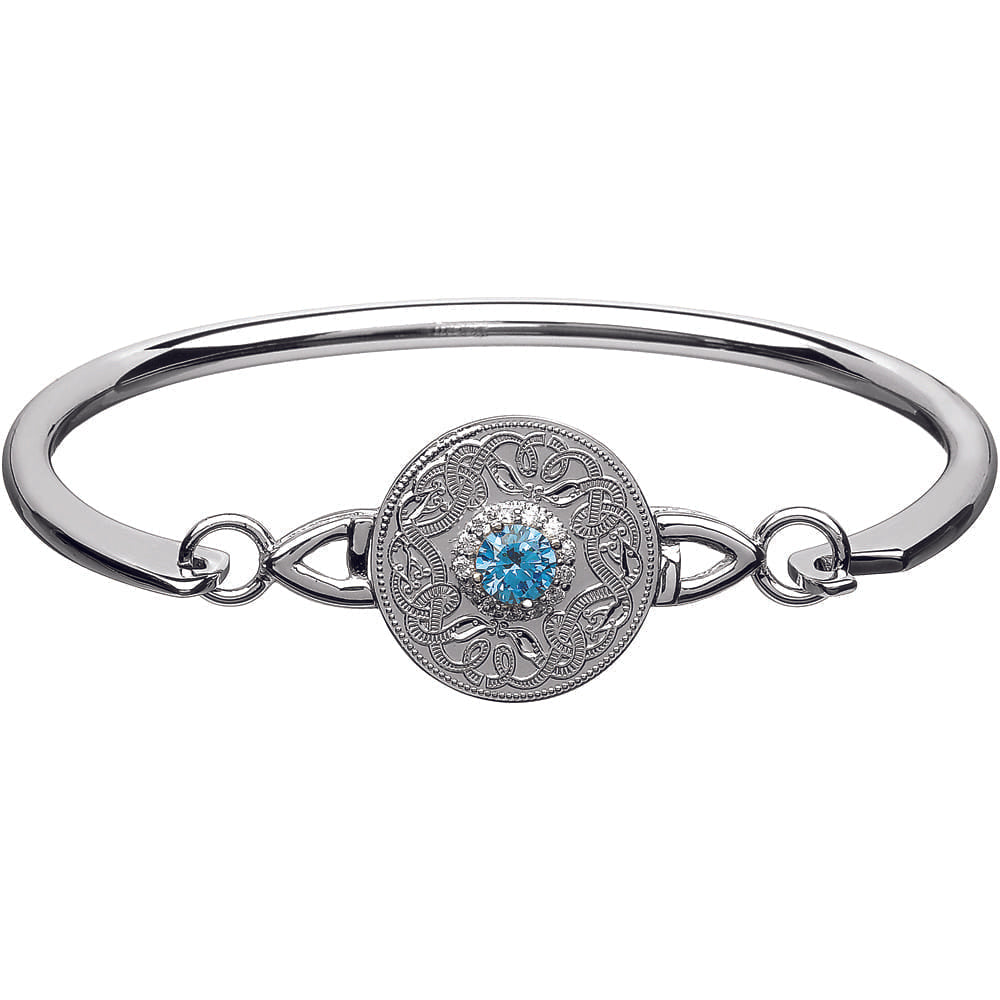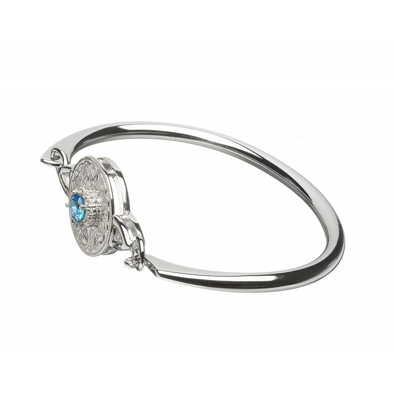 Part of our Ladies Celtic Warrior collection of jewelry, this bangle is new to the collection and is quite simple and beautiful. The shield which is centered with a 4.5 mm Swiss Blue CZ and is surrounded with 12 clear CZ each measuring 1.25 mm