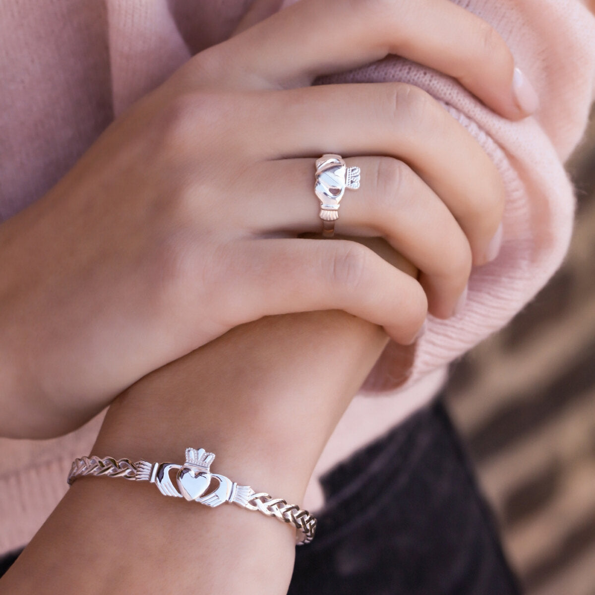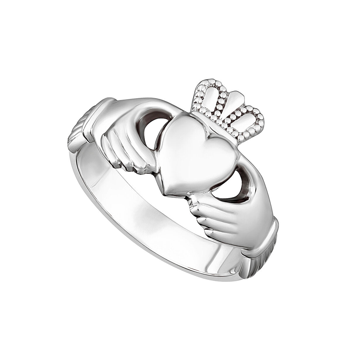 The story of the Claddagh on this ring is a tale of eternal devotion. Its design echoes the words of the Irish sailor who first crafted it for his sweetheart “With these hands I give you my heart, and I crown it with my love”, and it's symbols represent love (heart), friendship (hands) and loyalty (crown). This precious ladies sterling silver, Claddagh ring has been Irish hallmarked in Dublin Castle.