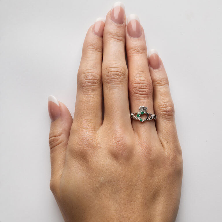 Open Heart Claddagh Ring w/ Green Crystals - 4 is backordered and will ship as soon as it is back in stock.