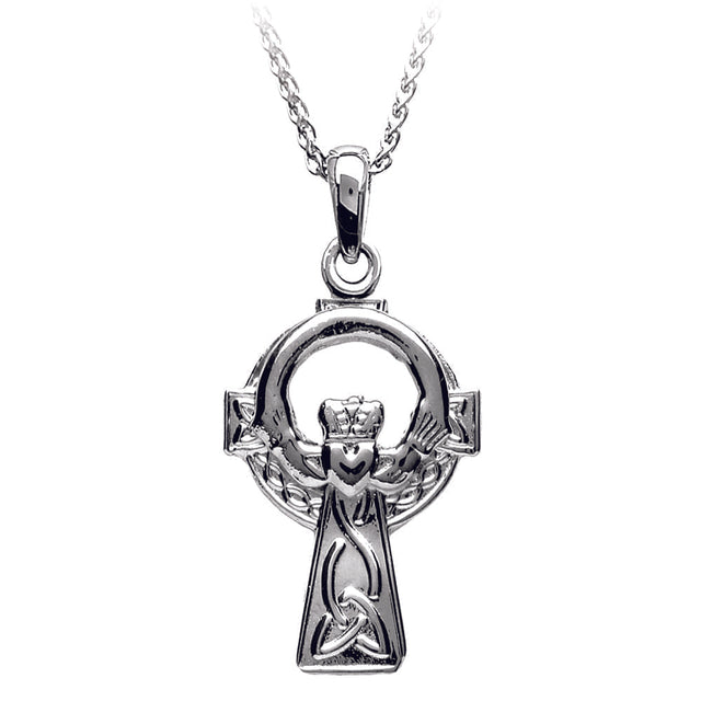 This small Claddagh Cross Pendant has a traditional shape with a Claddagh symbol to the center. It also has an iconic Celtic Trinity knot design to the shaft of the cross.