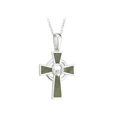 This sterling silver Connemara marble cross pendant has been created using Connemara marble, a unique stone dating back over millions of years and known as “Ireland’s gemstone”. Our Connemara marble is authentic, coming from a family mine in Connemara itself. The Celtic Cross in this pendant is a symbol of faith, dating back to the ninth century, and the Claddagh represents love, loyalty and friendship.