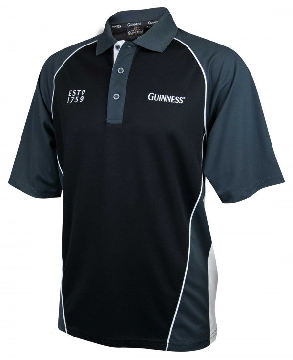 Experience comfort and style on the course with this Guinness golf shirt, crafted from 100% polyester moisture-wicking fabric that keeps you dry throughout your game. Featuring sleek black and charcoal grey panels accented with subtle white piping on the front and back, this shirt also displays an embroidered Guinness logo on the left chest, 'ESTD 1759' on the right chest, and Arthur Guinness signature on the sleeve for a distinguished look. Perfect for an 18-hole round or casual wear, it combines performance and heritage effortlessly.