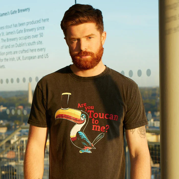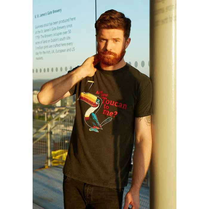 These graphic tees feature a front distressed print, the garment wash gives a vintage look and all the same qualities of a great fitting t-shirt with classic Guinness graphics. The tee comes in a washed grey color with a distressed Guinness® Toucan & Are You Toucan to me screen printed on the front.