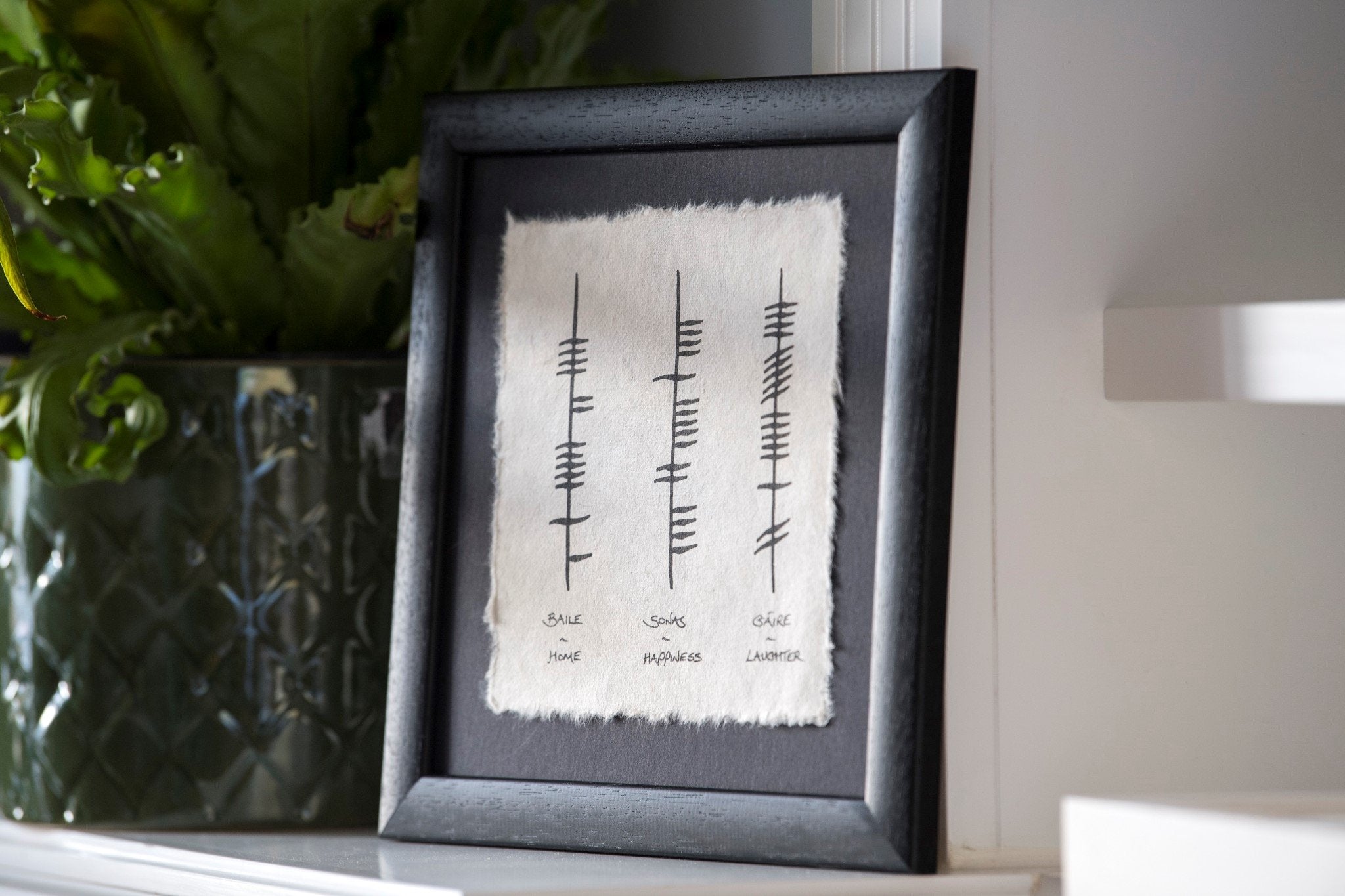 Ogham Wishes - Home/Happiness/Laughter - Small Frame is backordered and will ship as soon as it is back in stock.