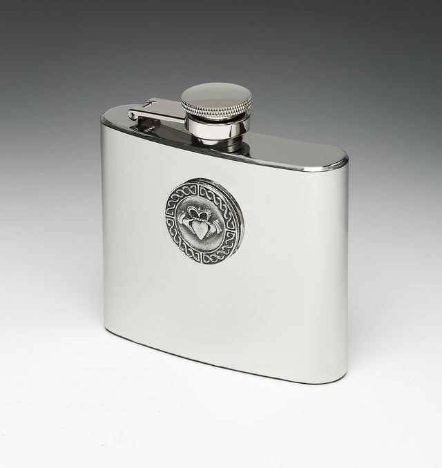 A Pewter Hip Flask Embossed with a Pewter Disc, with a Claddagh encircled with a Celtic Design with a 5oz capacity.