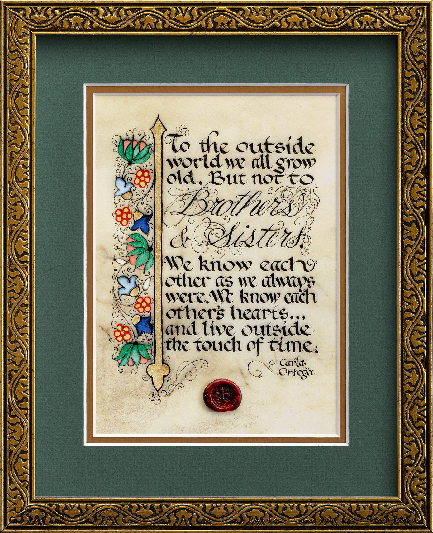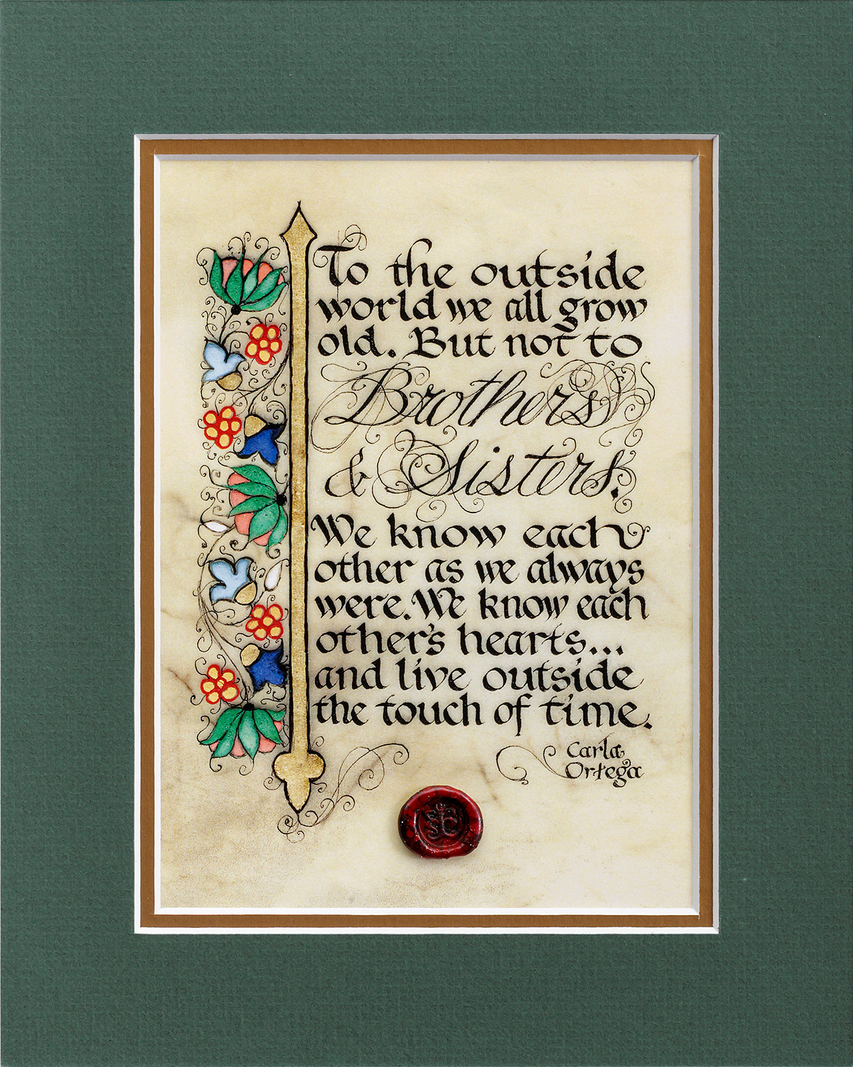 - Fine art print reproduction of original illuminated manuscript hand-lettered onto calfskin vellum by the artist