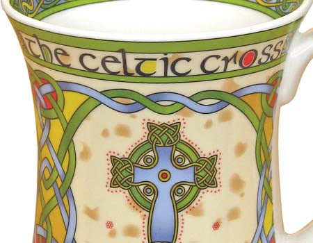This bone china mug depicts a Celtic High Cross in the style of 9th century ancient Celtic manuscripts which would have been painted by monks onto vellum or calf skin.
