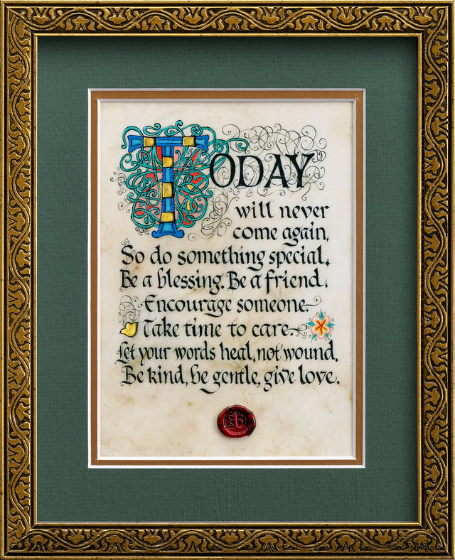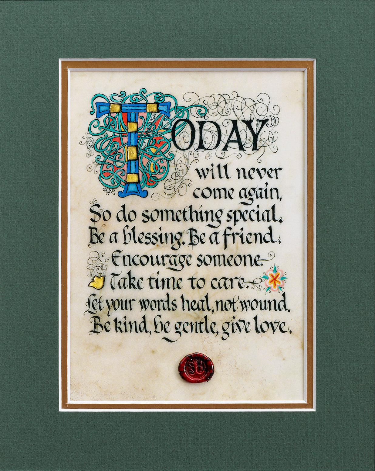 - Fine art print reproduction of original illuminated manuscript hand-lettered onto calfskin vellum by the artist