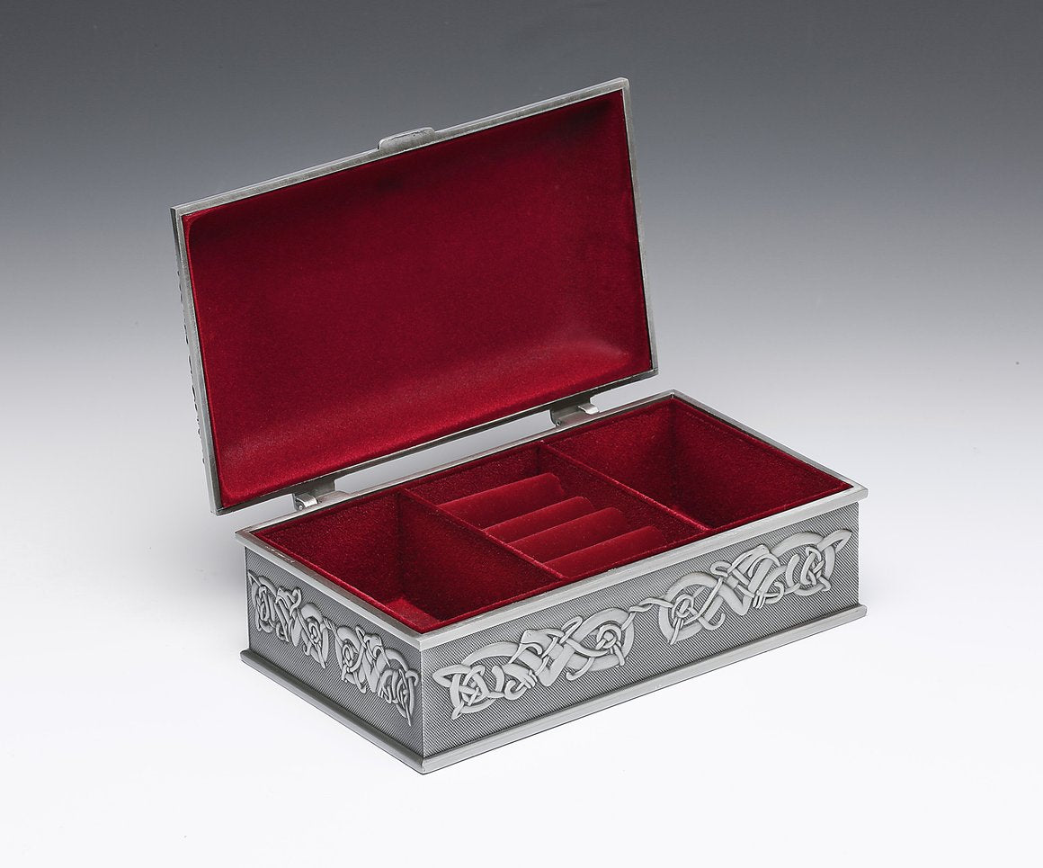 Each box is embossed on all sides and lid with a Celtic design and the Claddagh on top. The interior is lined with red felt with a compartment for rings/earrings and other precious items.
