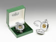 This watch has an open-face design and allows reading the time without opening the watch. The design is that of the Claddagh taken from the famous love symbol designed in the town of Claddagh, Co. Galway by Richard Joyce back in the year 1689. The design is often used for wedding rings as it is based on the ring that Richard made for his bride to be. The symbolism's are "hands for friendship", "heart for love" and "crown for loyalty".