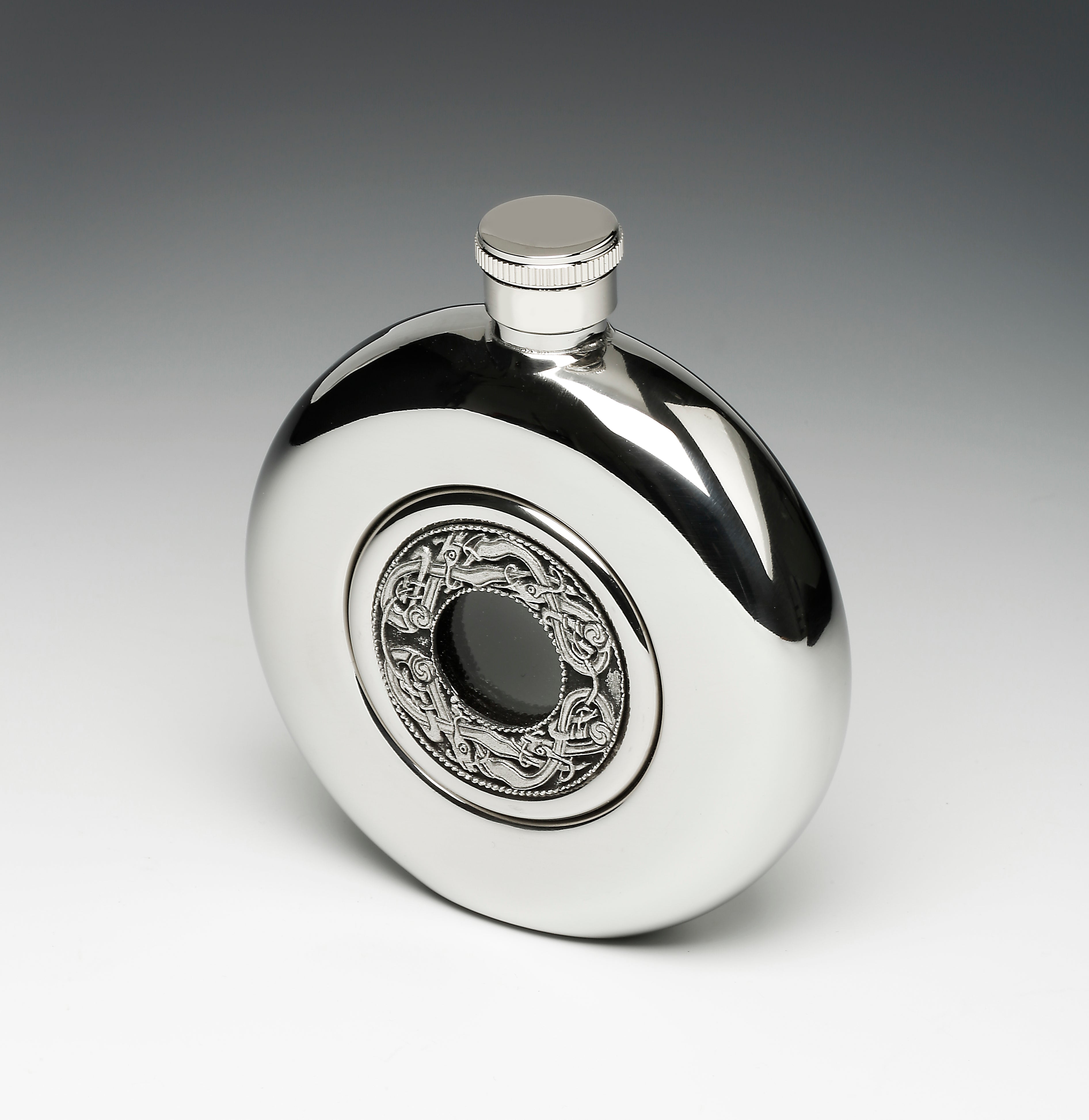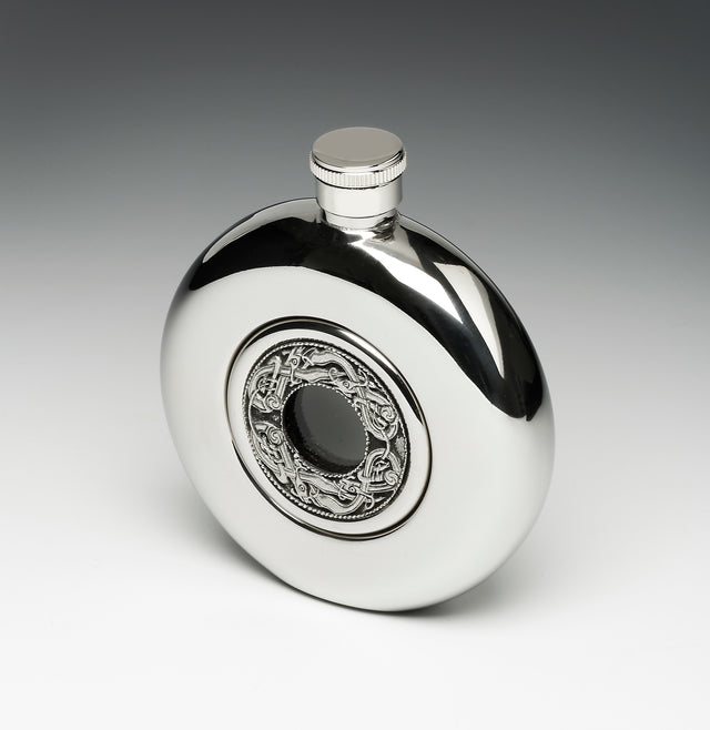 Round Whiskey Hip Flask with Glass Center and Celtic Birds Design.