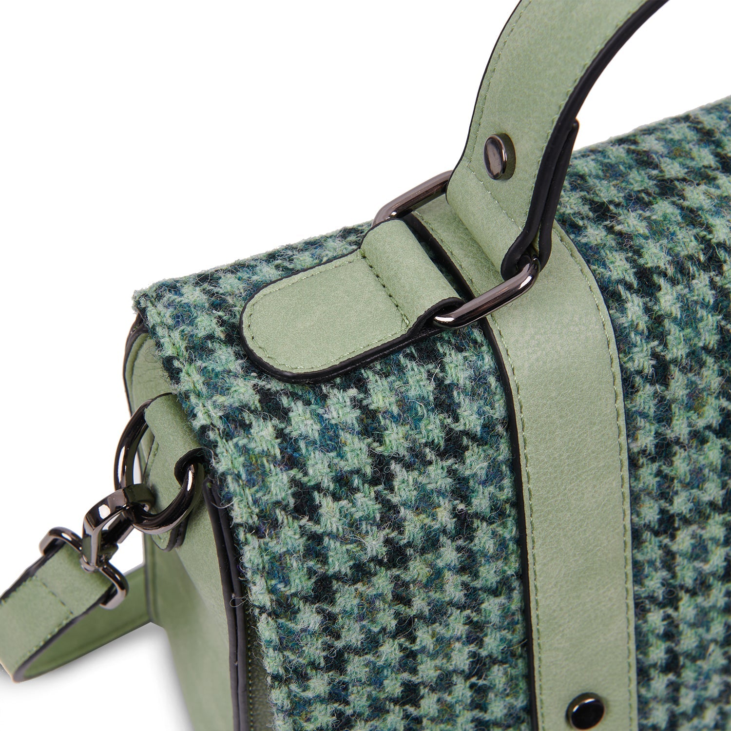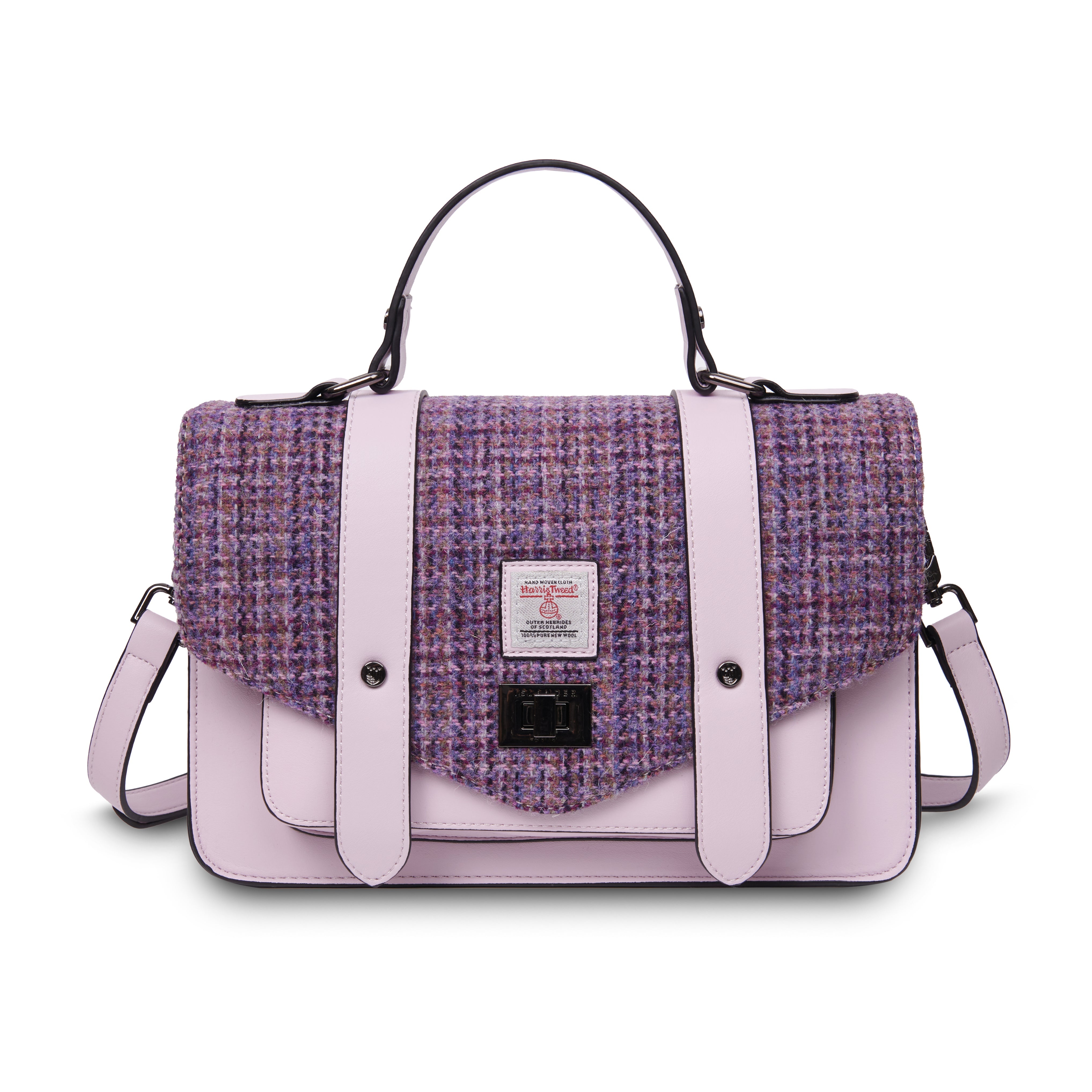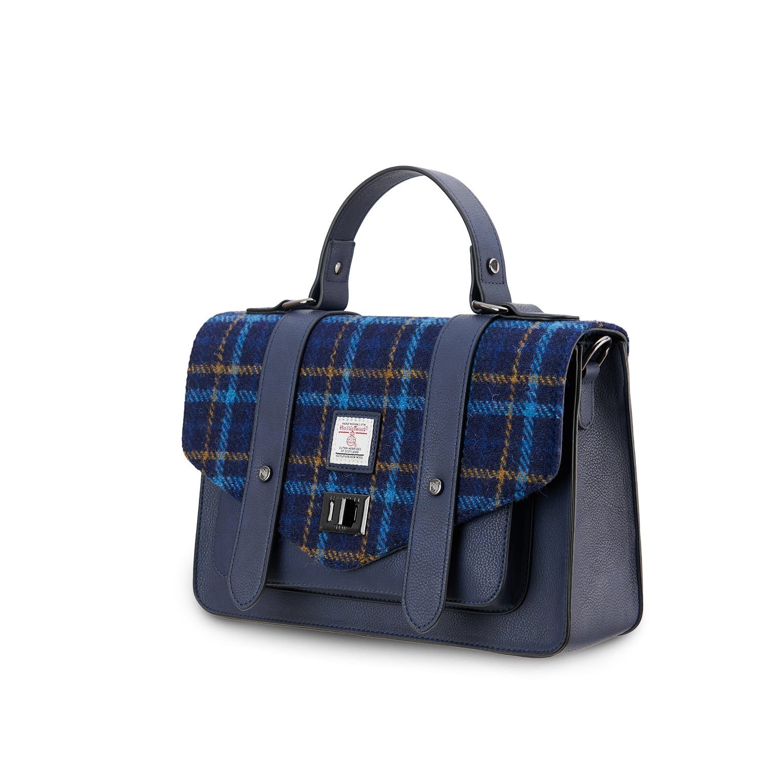 Paired with eco-conscious vegan microfiber leather, this satchel combines heritage with modern values. Striking tartan and herringbone patterns add distinctive character while remaining timelessly elegant.
