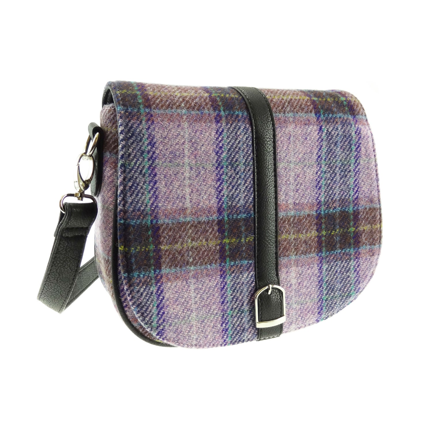 This saddle shaped Harris Tweed shoulder bag is available in a large choice of tartans. It has a long adjustable shoulder strap to suit any height. It has a zippered pocket on the inside.