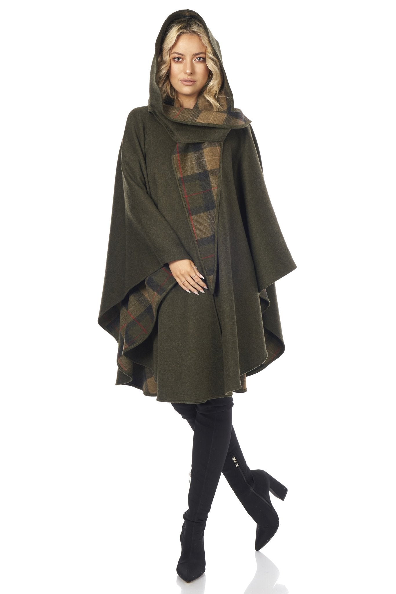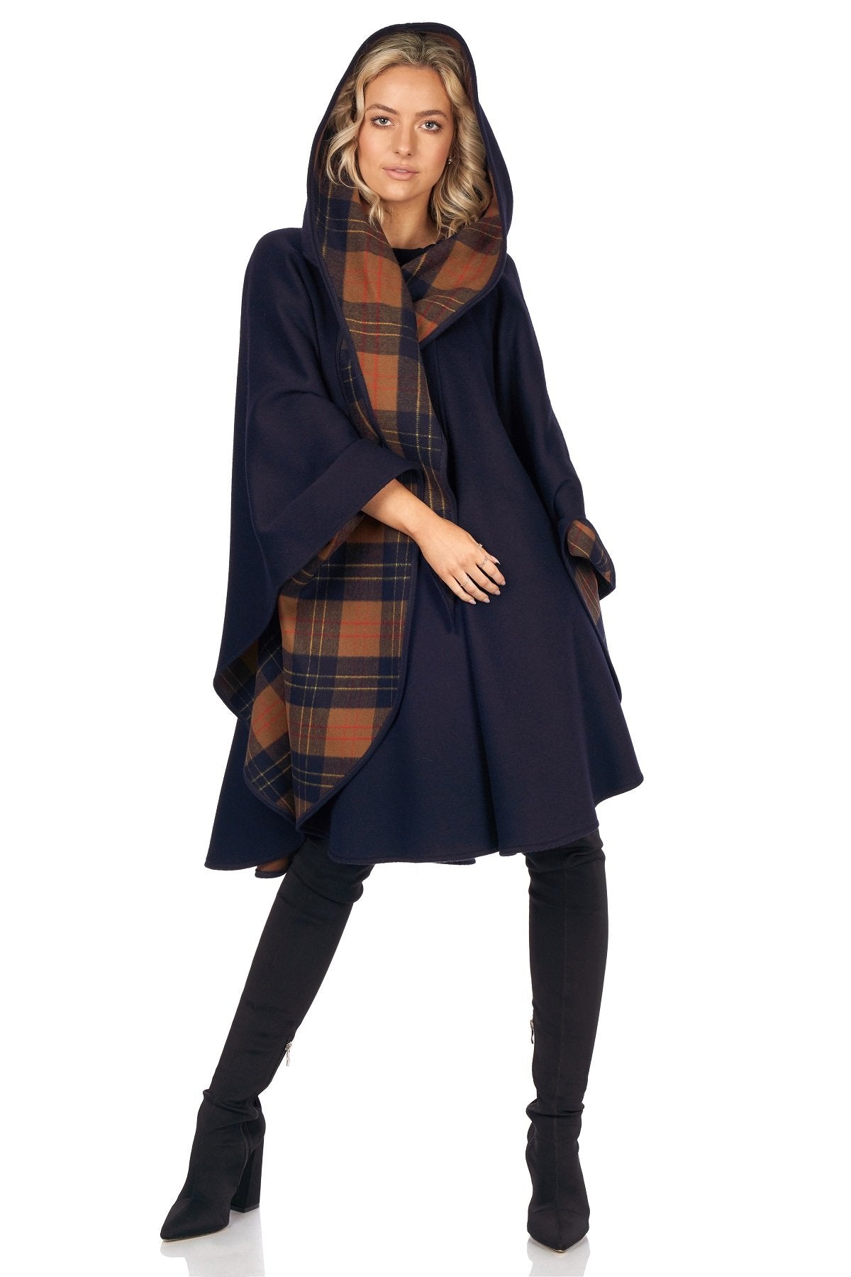 Knee Length Cape in Double-Face Cloth with Convertible Hood - Charcoal with Camel Stewart Tartan Interior - Double Face Cloth Cape is backordered and will ship as soon as it is back in stock.