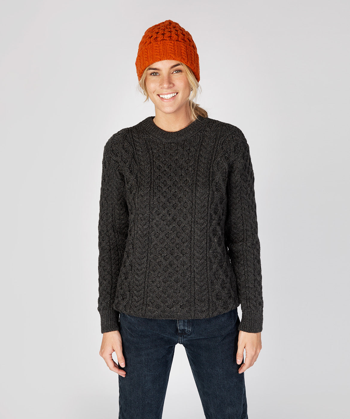 Our classic Aran beanie hat is knitted with traditional aran stitches of honeycomb, lattice and cables to keep you warm. Made from a blend of 95% wool, 5% cashmere for an even softer, more luxurious feel to cosy into.
