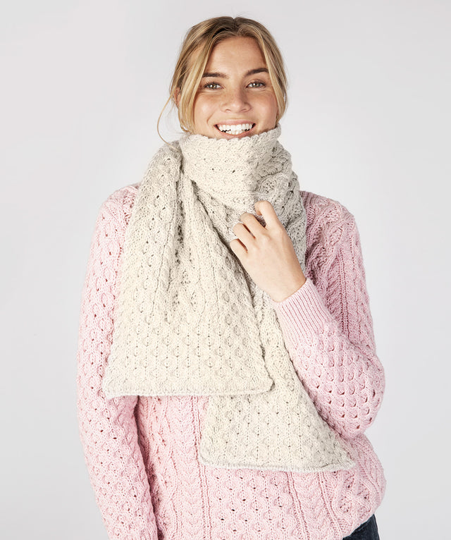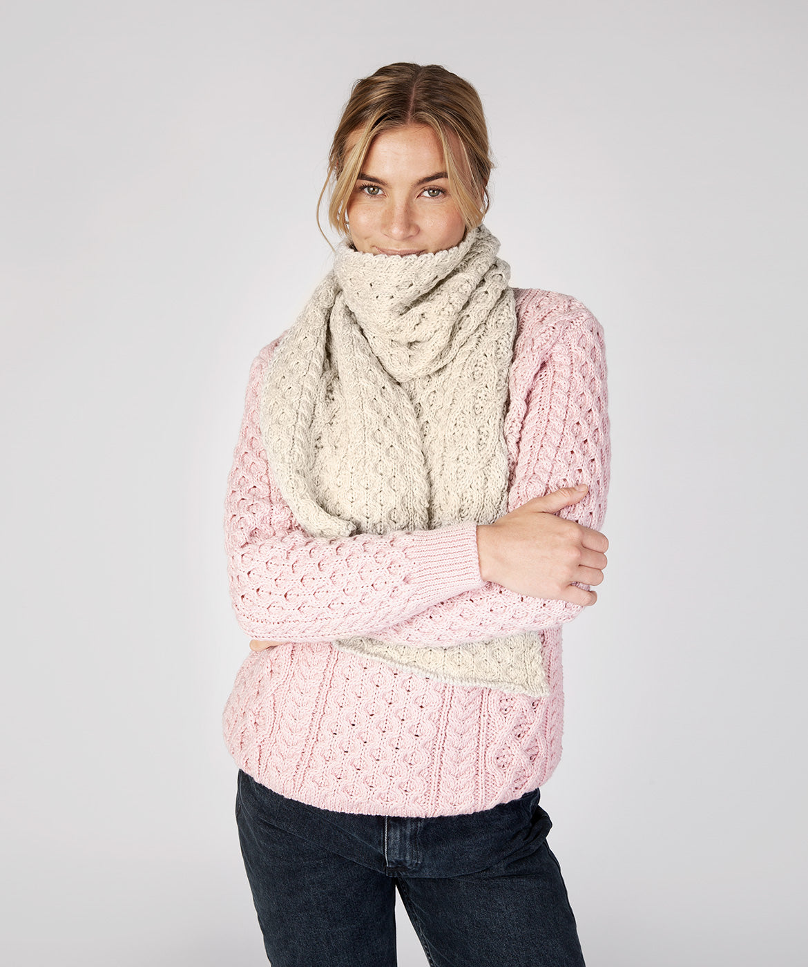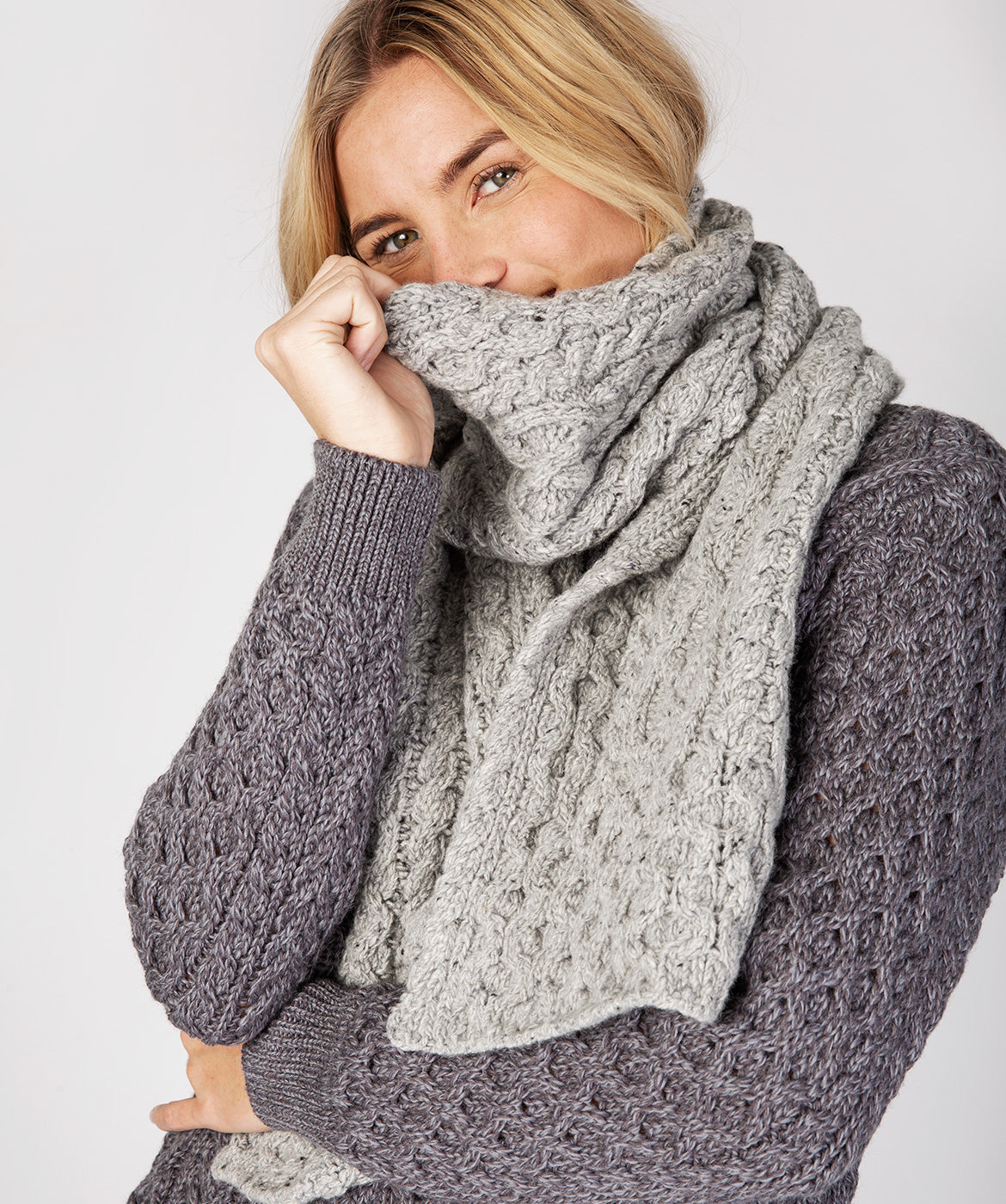 Our classic Aran scarf knitted with traditional Aran stitches of honeycomb, lattice and cables to keep you warm. Made from a blend of 95% wool, 5% cashmere for an even softer, more luxurious feel to cozy into.