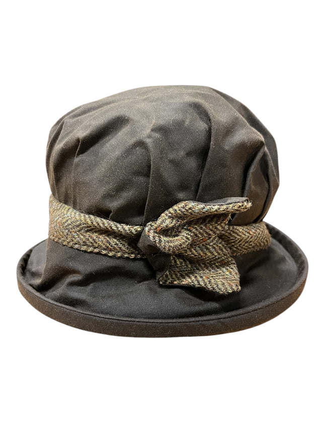 Waxed Cotton Downton Abbey Style Ladies Hat with Tweed Bow and Band