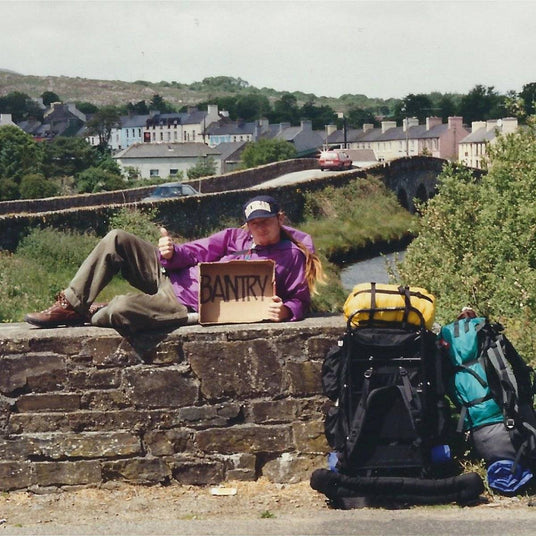 Hitching a ride near Ballydehob, West Cork, June 1991. Meredith and I backpacked around Ireland, Scotland, and northern England before returning to Wales.