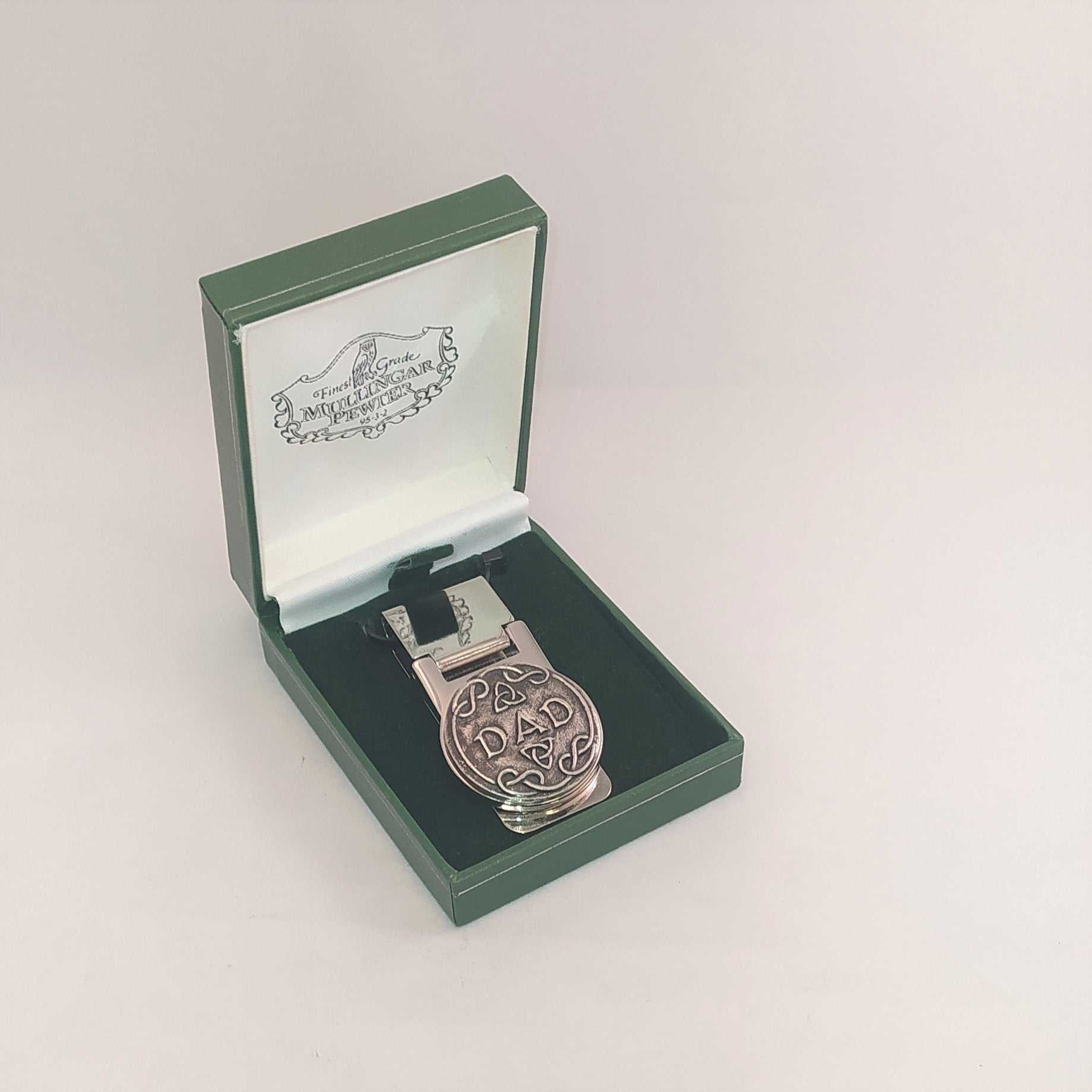 This Pewter Celtic design money clip will make a great Irish gift for him. Made in County Westmeath by the renowned Mullingar Pewter company. A tradition which dates back some 800 years, the craftsmanship on this Celtic money clip is exquisite and bears the word Dad and the Trinity design, representing Life, Death and Re-Birth or Father, Mother & Child.